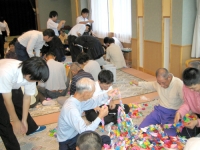 9月25日、2004年度第一回目の千羽鶴の糸ぬきと金紙、銀紙、ビーズなどを取り除く作業を東広島市志和にある社会福祉法人西志和農園の全面的な協力を得て、施設内の多目的ホールで行いました。