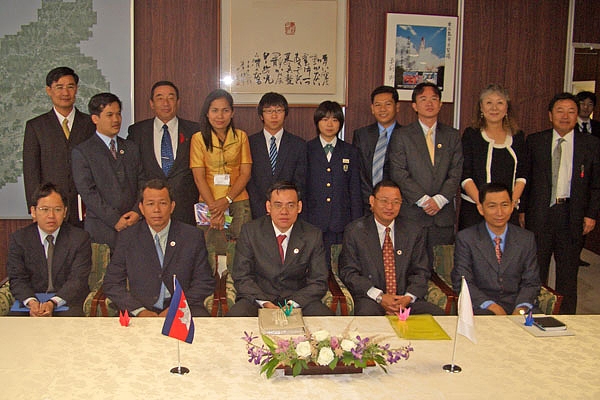 平成18年10月12日(木)東広島市役所第一応接室にて、東広島市長、助役、総務部長、企画部長、JICA中国国際センター長、HIC広島国際センター研修部長、JICA研修監理員、西志和農園施設長、志和中学校長、生徒代表、忠海高校ボランティア部顧問、生徒代表、竹原市役所、千羽鶴未来プロジェクト代表理事他2名が参加して、国際協力機構(JICA)研修で、地方行政を学びに来ているカンボジア国からの10人の研修員に対して、千羽鶴未来プロジェクト正会員である蔵田市長から再生ノート100冊とボールペン100本を寄贈した。